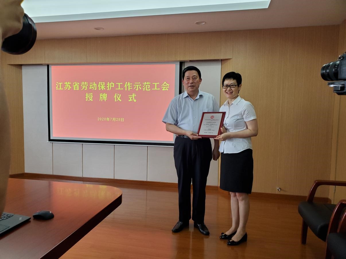 (無錫市委常委、市總工會主席陳德榮代表江蘇省總工會為紅豆集團工會授牌) 7月28日,在無錫錫山區總工會勞動保護工作匯報會上,無錫