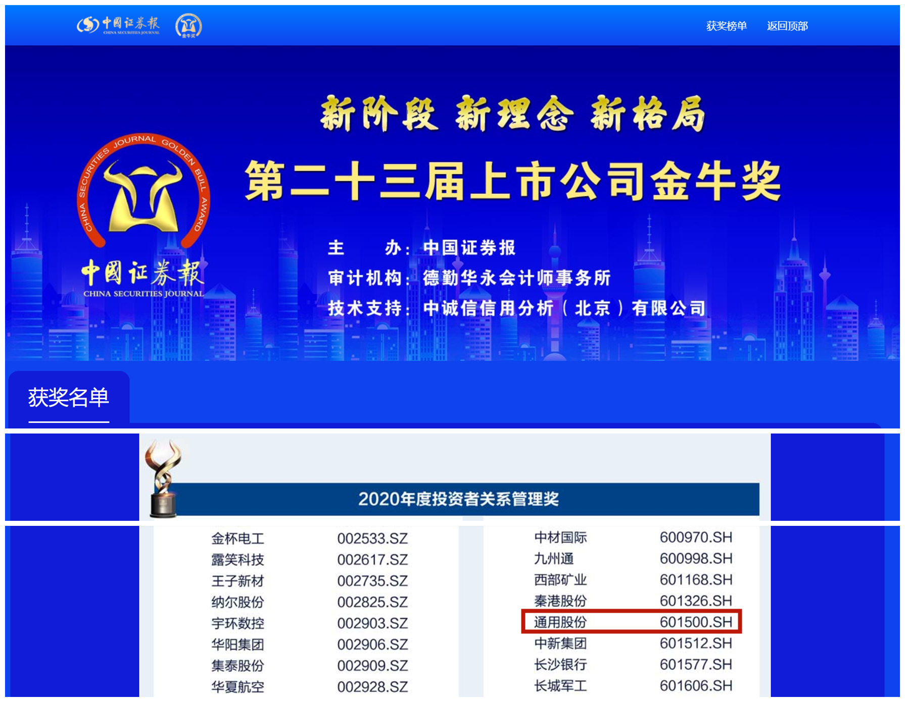 據了解,金牛獎是中國證券報鼎力打造的金融品牌,旨在公開、公正、公平原則下,表彰上一年度業績優秀、治理卓越、具有崇高使命和社會責任感的上市公司。自1999年創立以來,金牛獎評選已至第二十三屆,是中國資本市場最具影響力的獎項,在中國資本市場中具有上市公司“奧斯卡”的美譽。